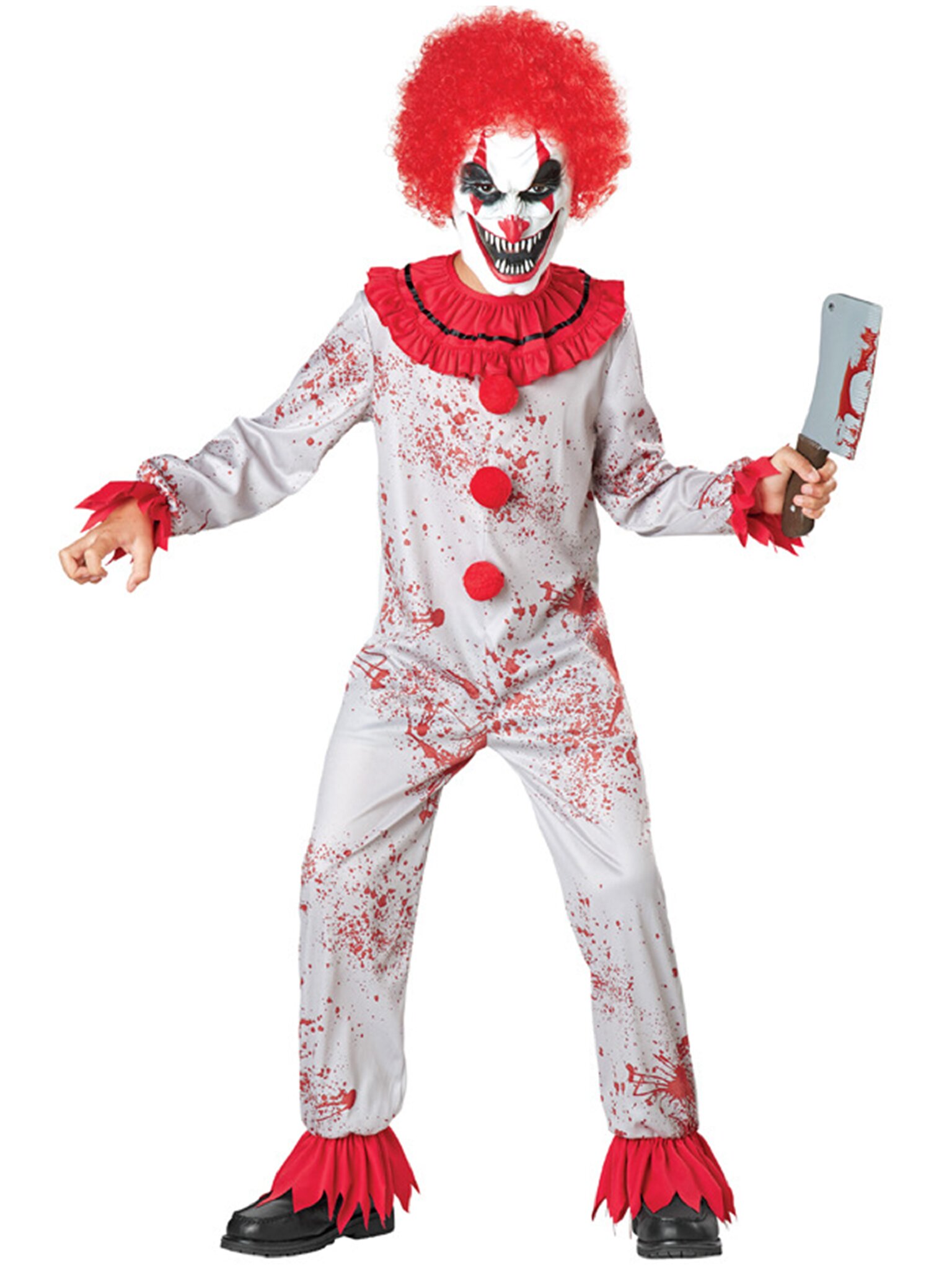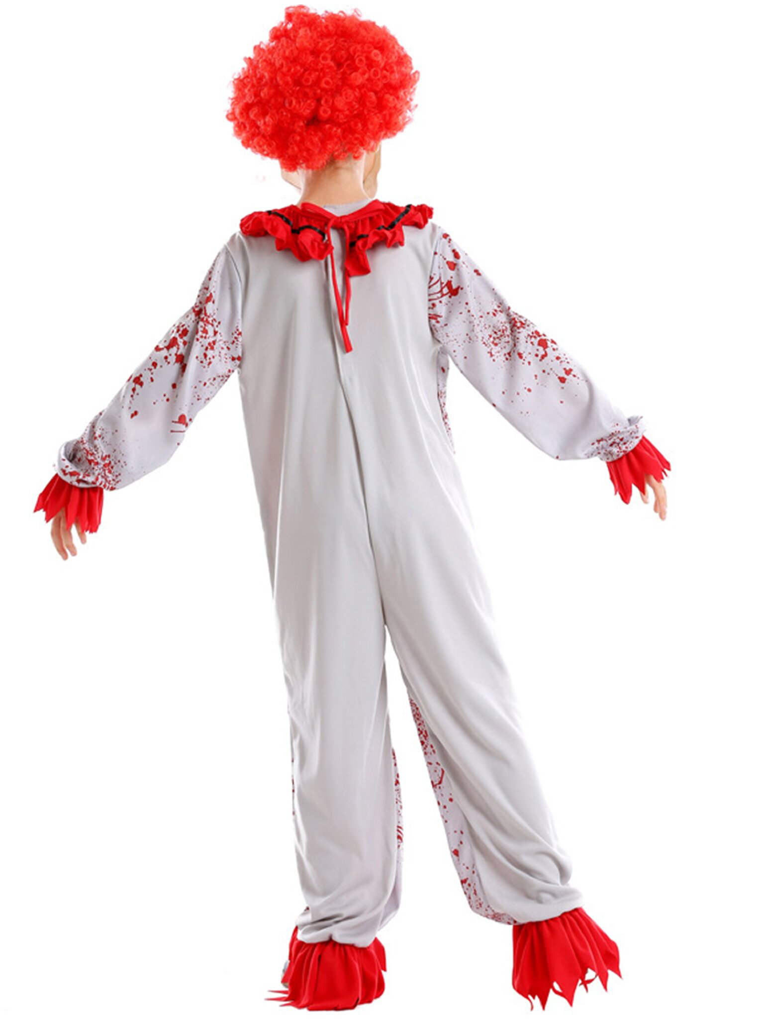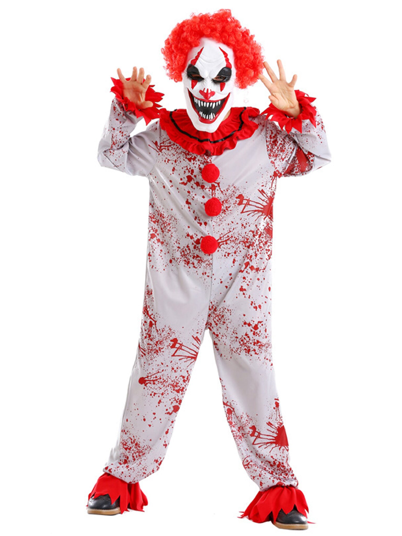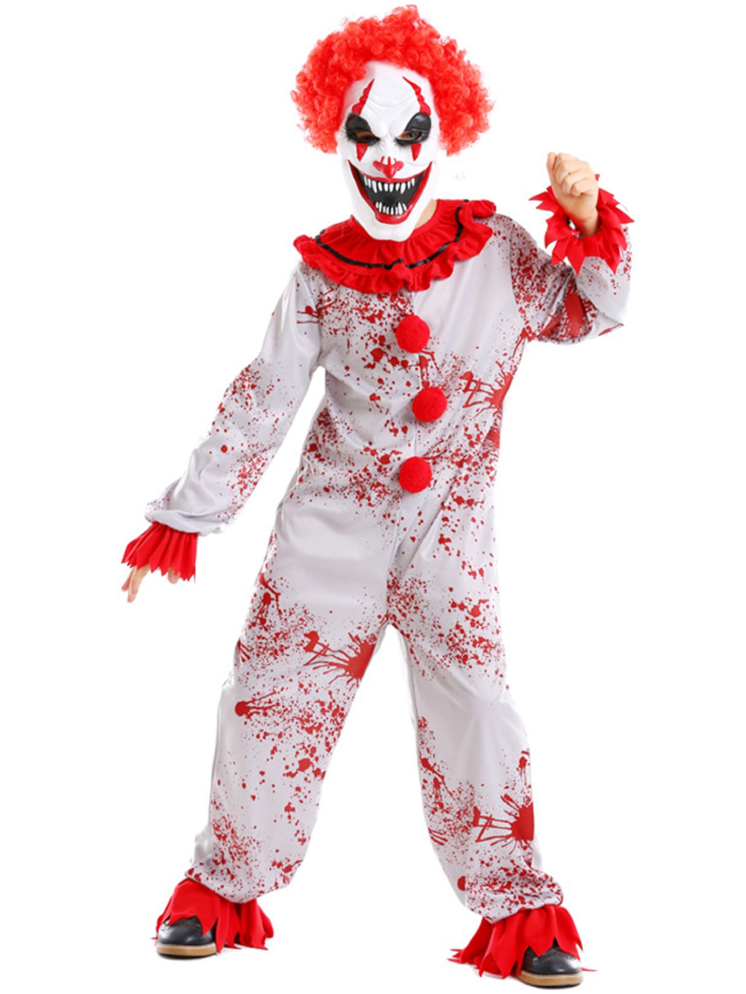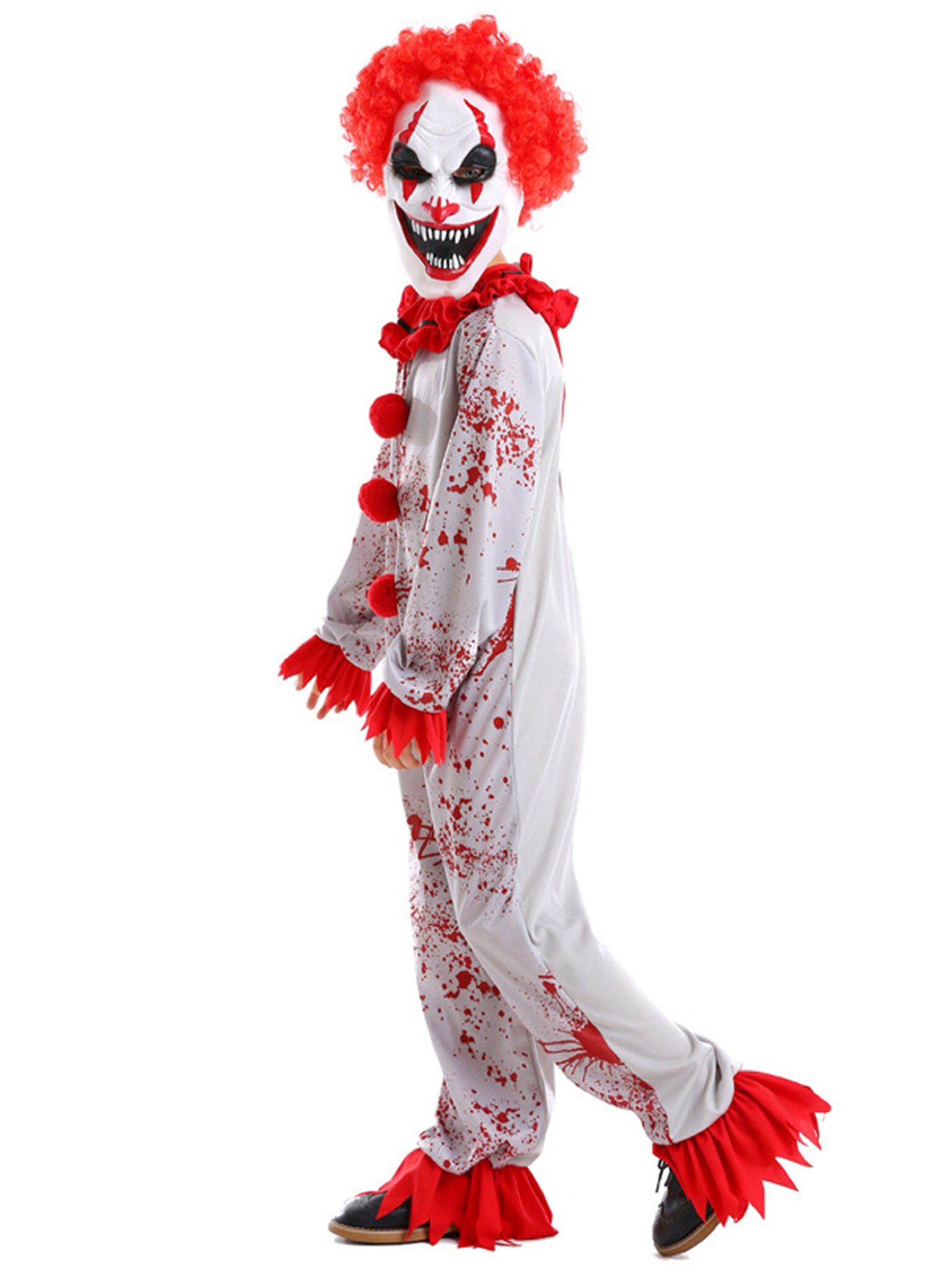 Детский костюм "Жуткий клоун" на Хэллоуин — идеальный выбор для создания пугающего образа. Серый комбинезон с эффектом брызг крови дополнен красным воротником и пуговицами-помпонами, которые привлекают внимание. Латексная маска с красными волосами завершает устрашающий облик, превращая вашего ребенка в настоящего персонажа хоррора. Изготовлен из полиэстера, костюм обеспечит комфорт и свободу движений во время любого праздника. Аксессуары в состав костюма не входит.