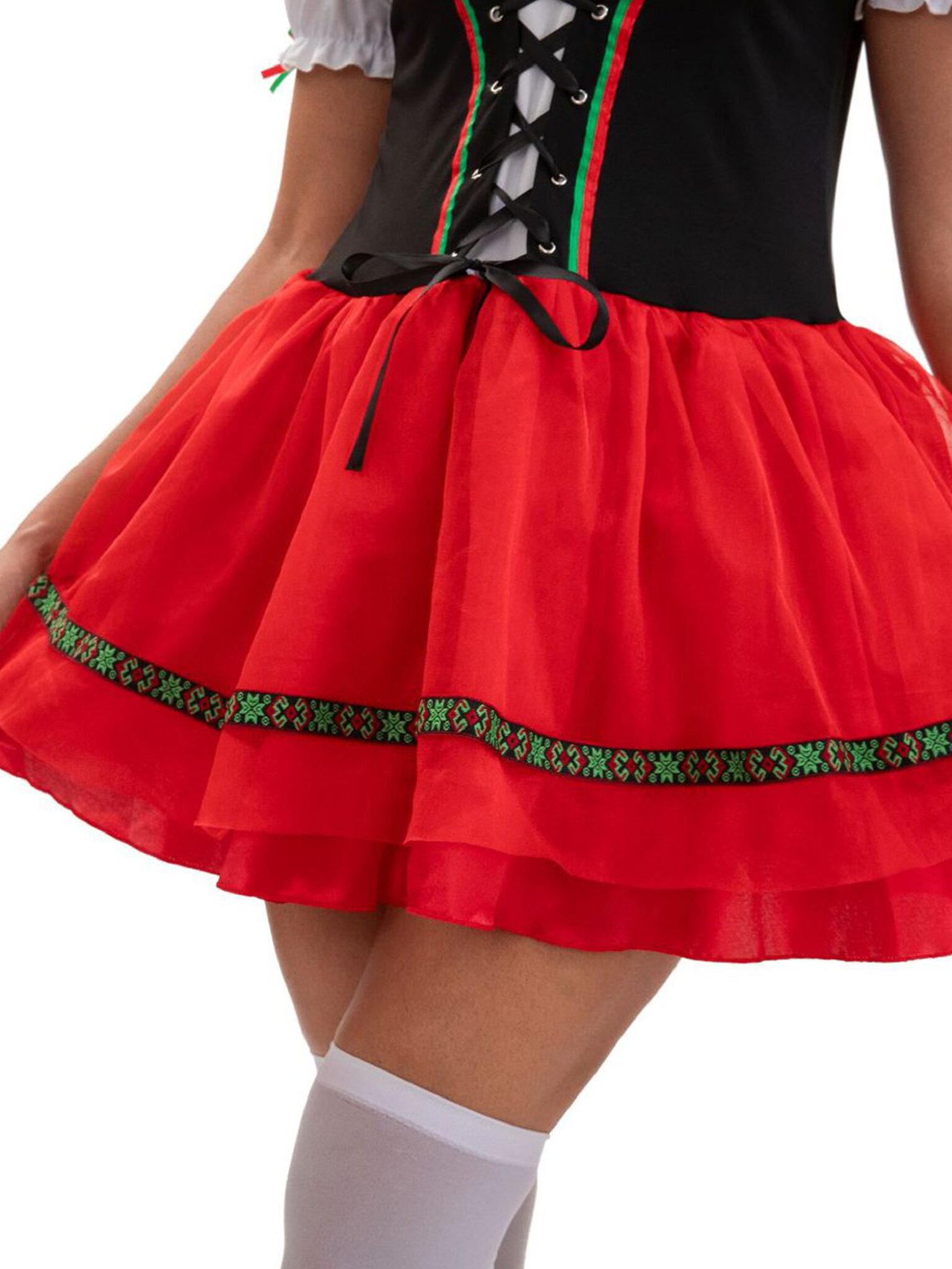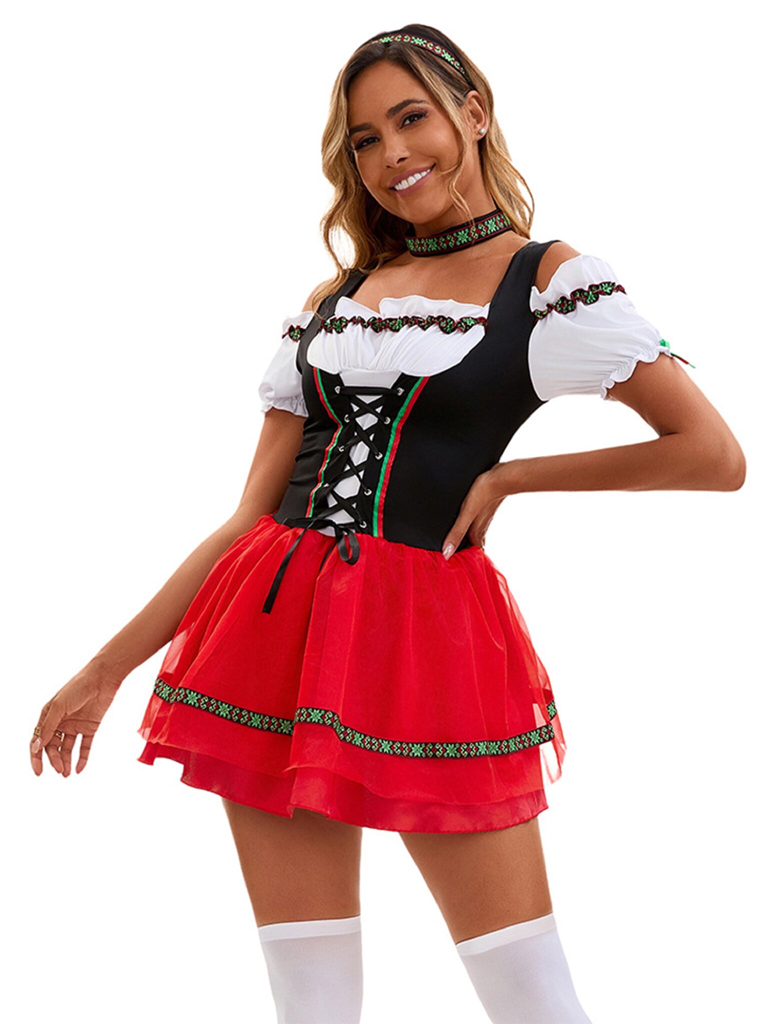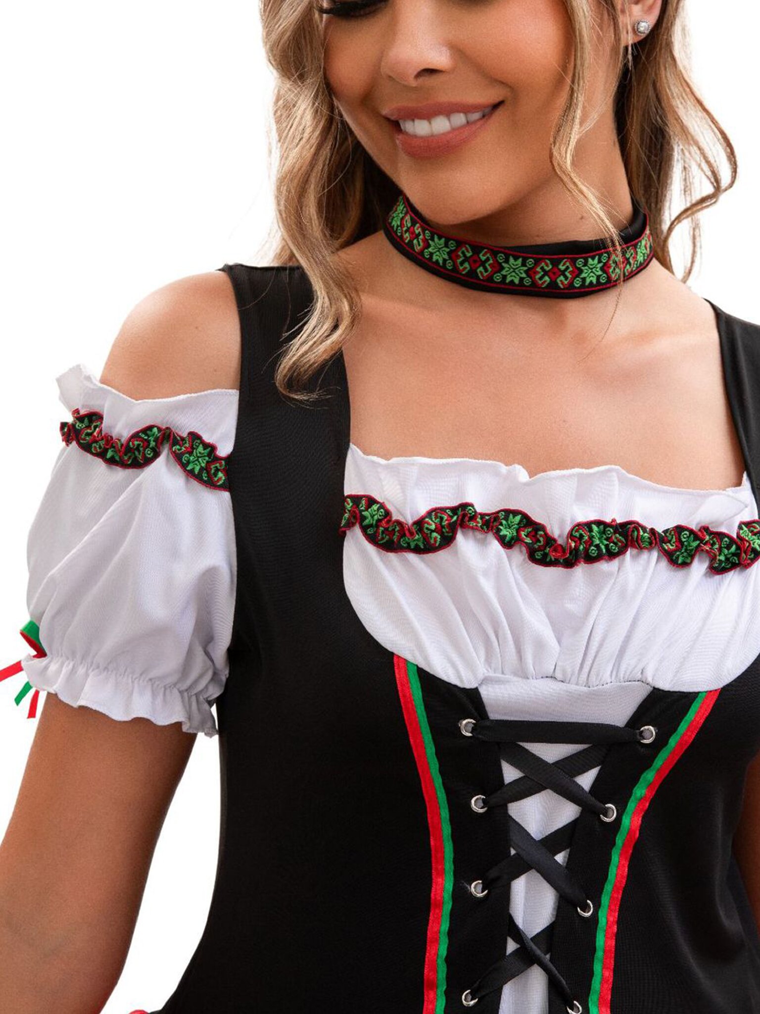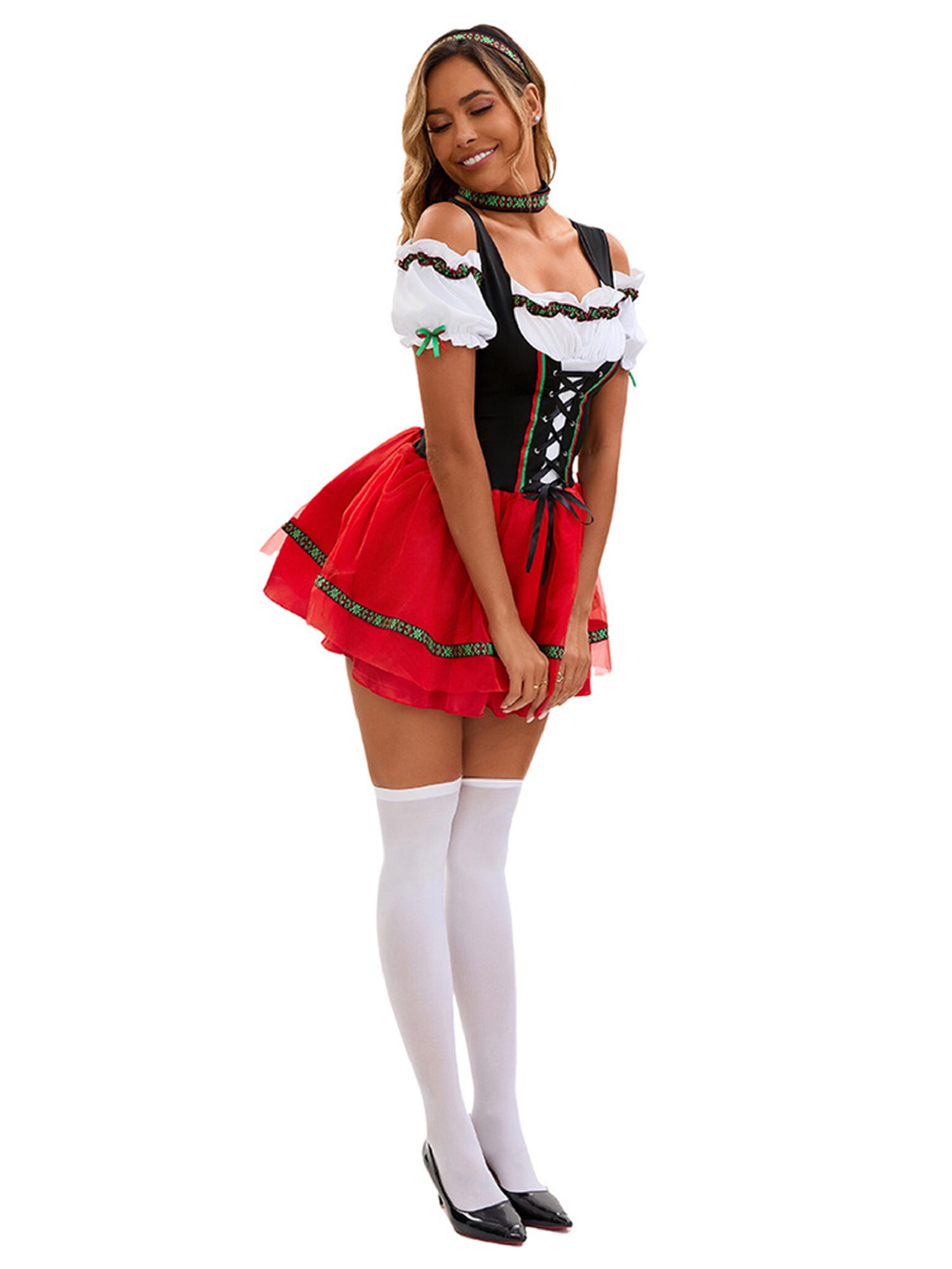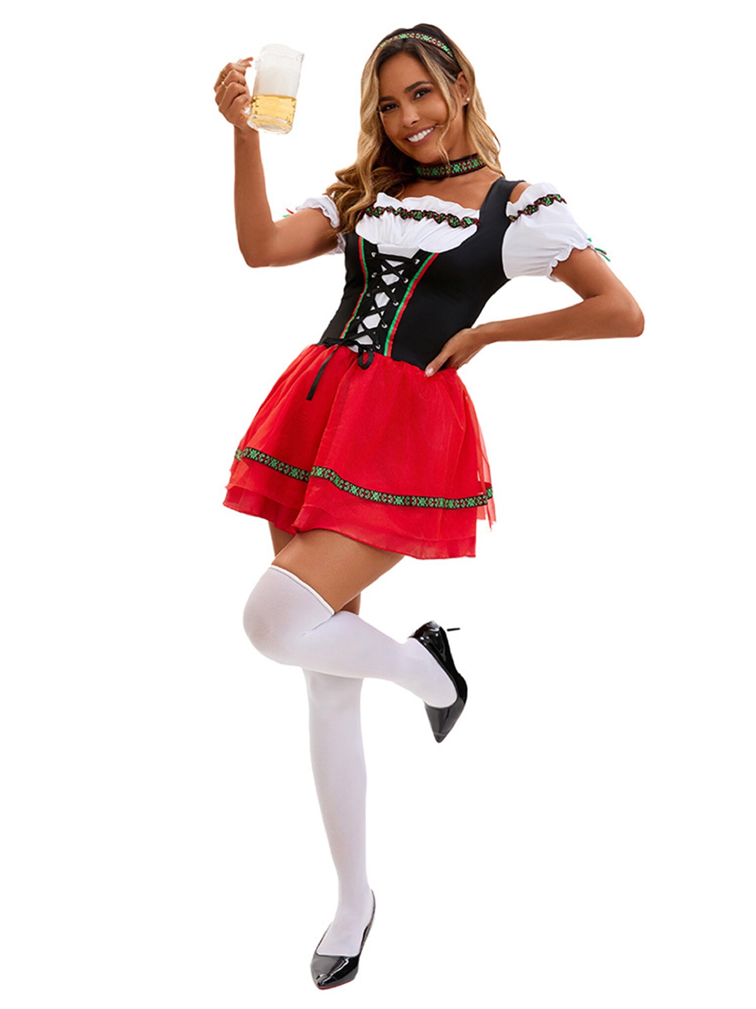 Погрузитесь в атмосферу Октоберфеста с костюмом баварки! Идеально подходящий для тематических вечеринок и праздничных событий, этот наряд подчеркнет ваш образ жительницы Баварии. Костюм из полиэстера включает мини платье с заметным сочетанием черного, белого и красного цветов, стильный чокер и оригинальное украшение на голову из тесьмы. Созданный для взрослых, он позволит вам выделиться на любом событии. Почувствуйте себя частью праздничной культуры Баварии с нашим национальным нарядом!